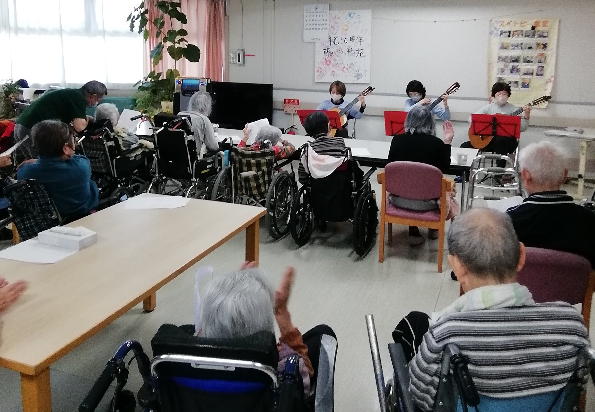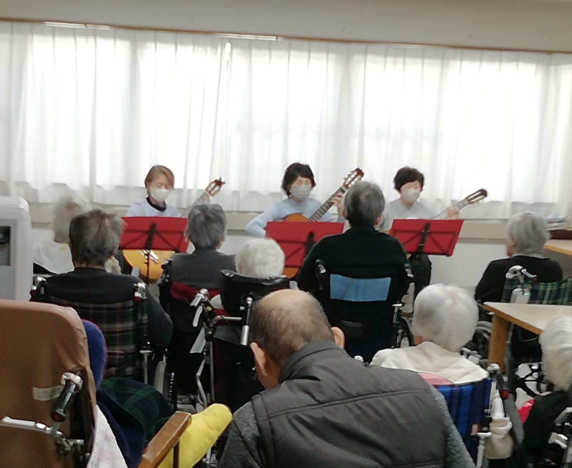 演奏の後には「みんなで歌いましょう」と、「スキー」や「真っ赤な太陽」といった懐かしのメロディーをギターに合わせて合唱しました。久しぶりに皆で声を合わせて歌う喜びを感じ、心躍るひとときとなりました。