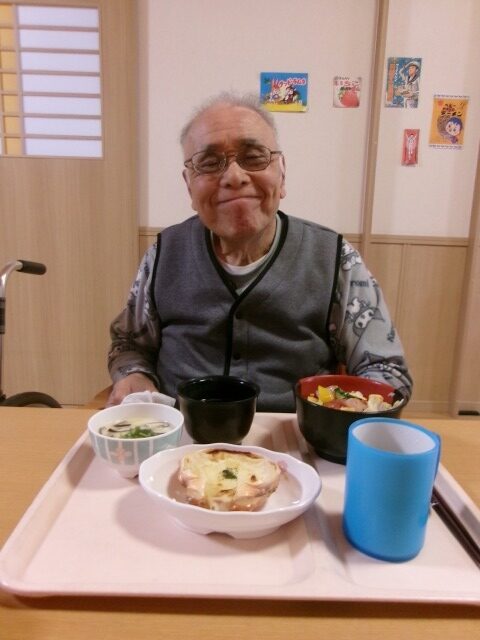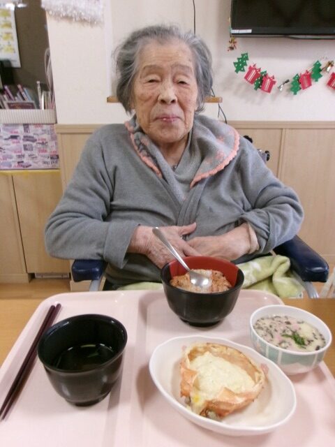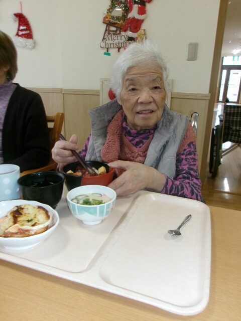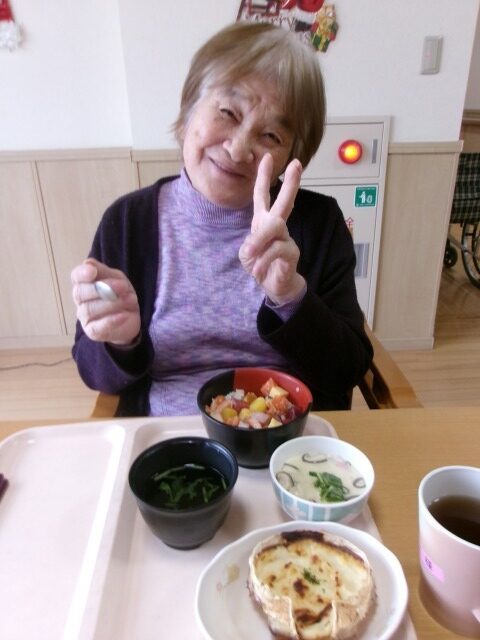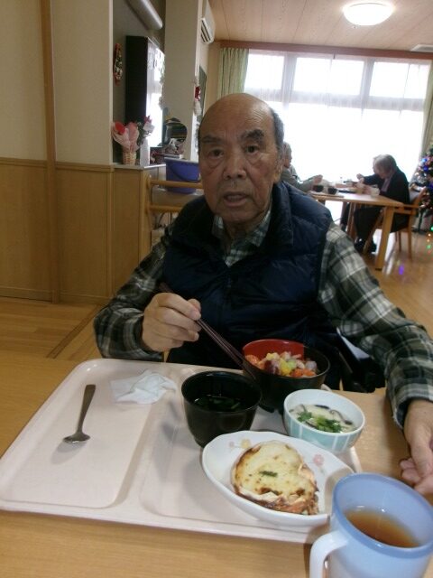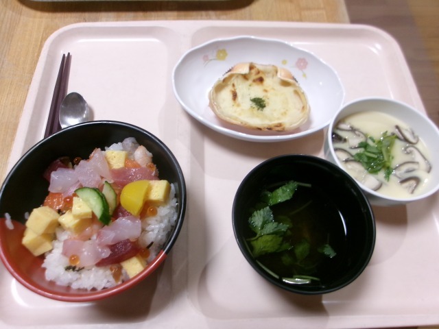 クリスマス昼食メニュー:刺身ばらちらし・グラタン・茶碗蒸し・お吸い物