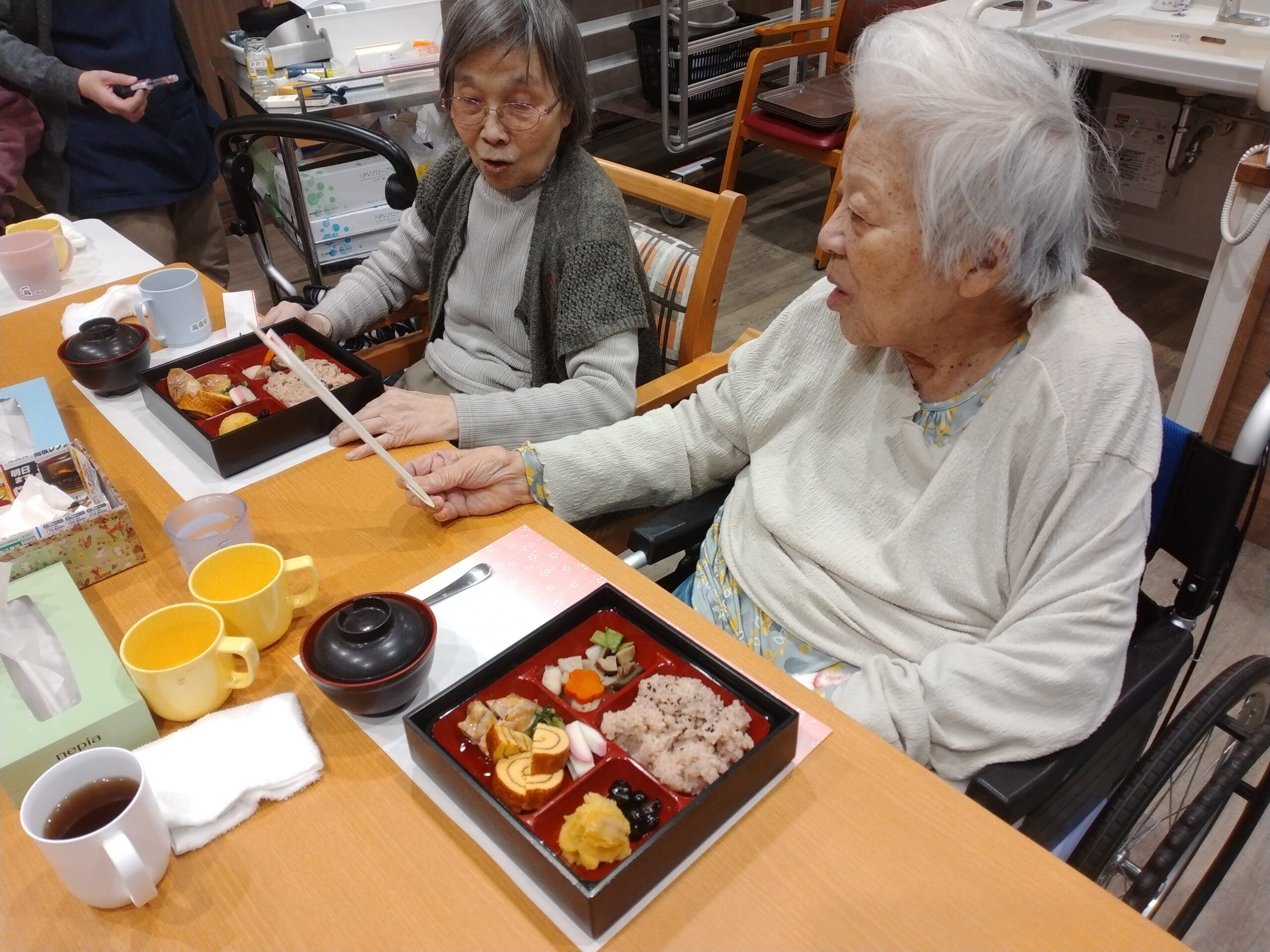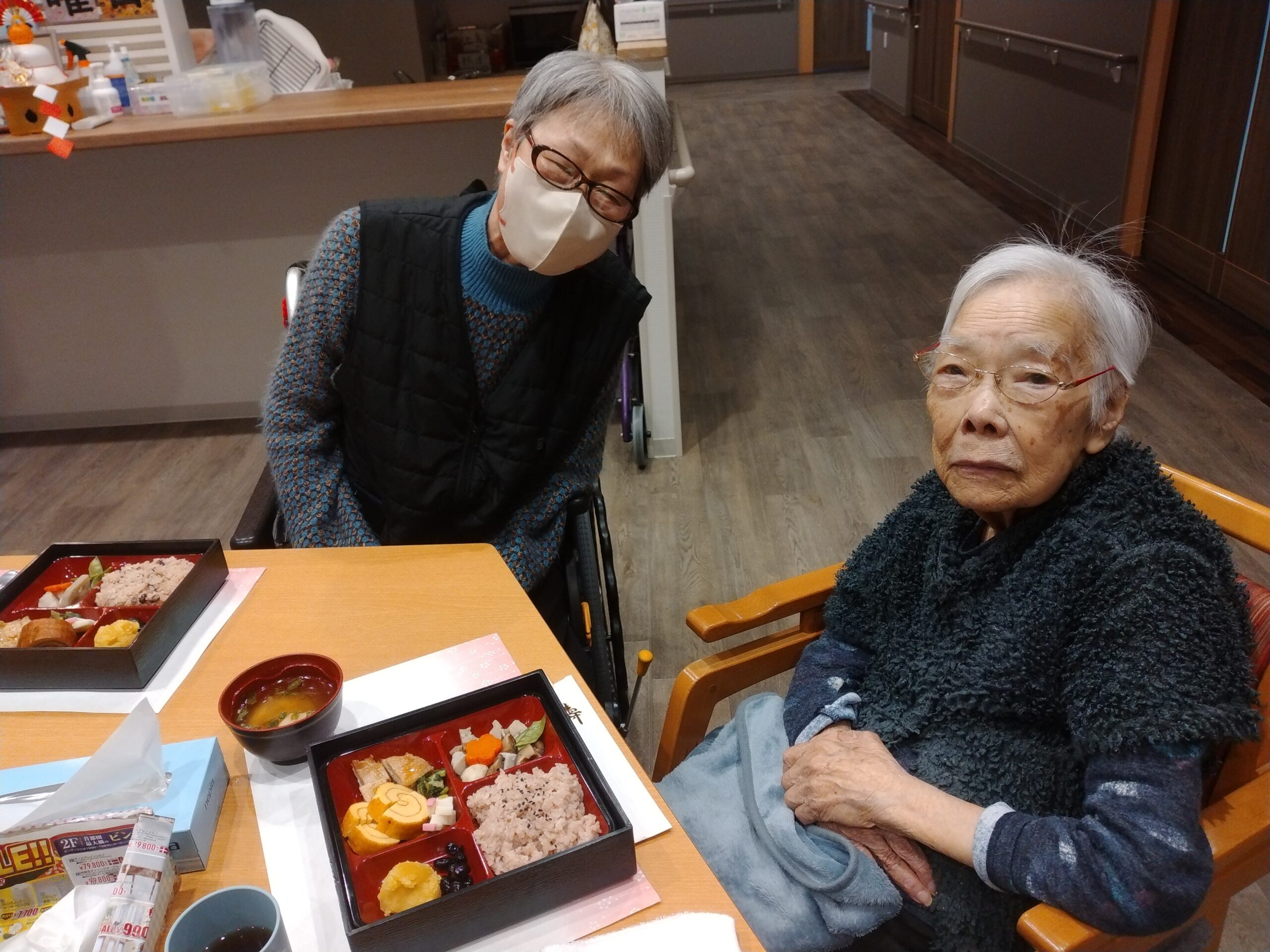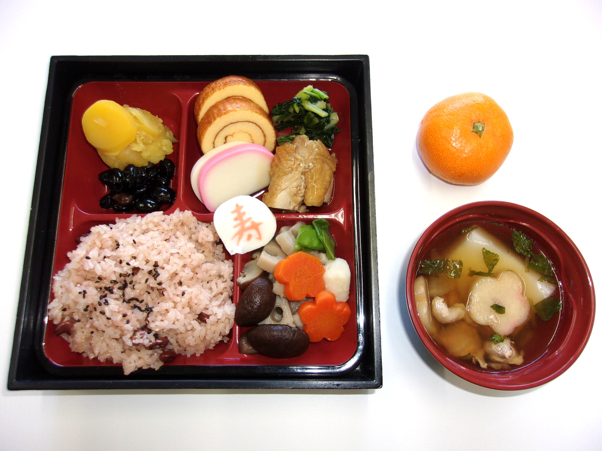昼食におせち料理でお祝いしました。