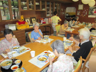 今日は、入居者の皆さんと一緒に、餃子、ポテトサラダ、ラーメンを作りました。野菜の下ごしらえは、見事な包丁さばきで野菜をみじん切りにして、餃子を一つ一つ手で包み始めると、皆さん手際が良く、あっという間にたくさんの手作り餃子が出来上がりました。焼きあがった餃子は、ラーメンとポテトサラダと一緒に昼食で召し上がりました。