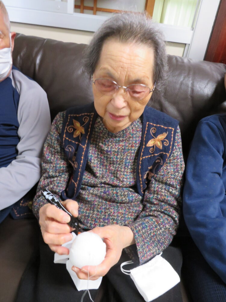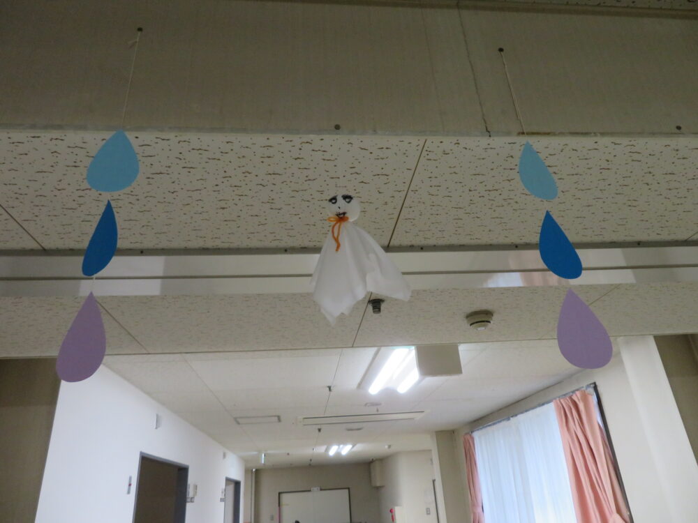 梅雨の時期になり、皆さんでてるてる坊主の飾りを作成しました♪