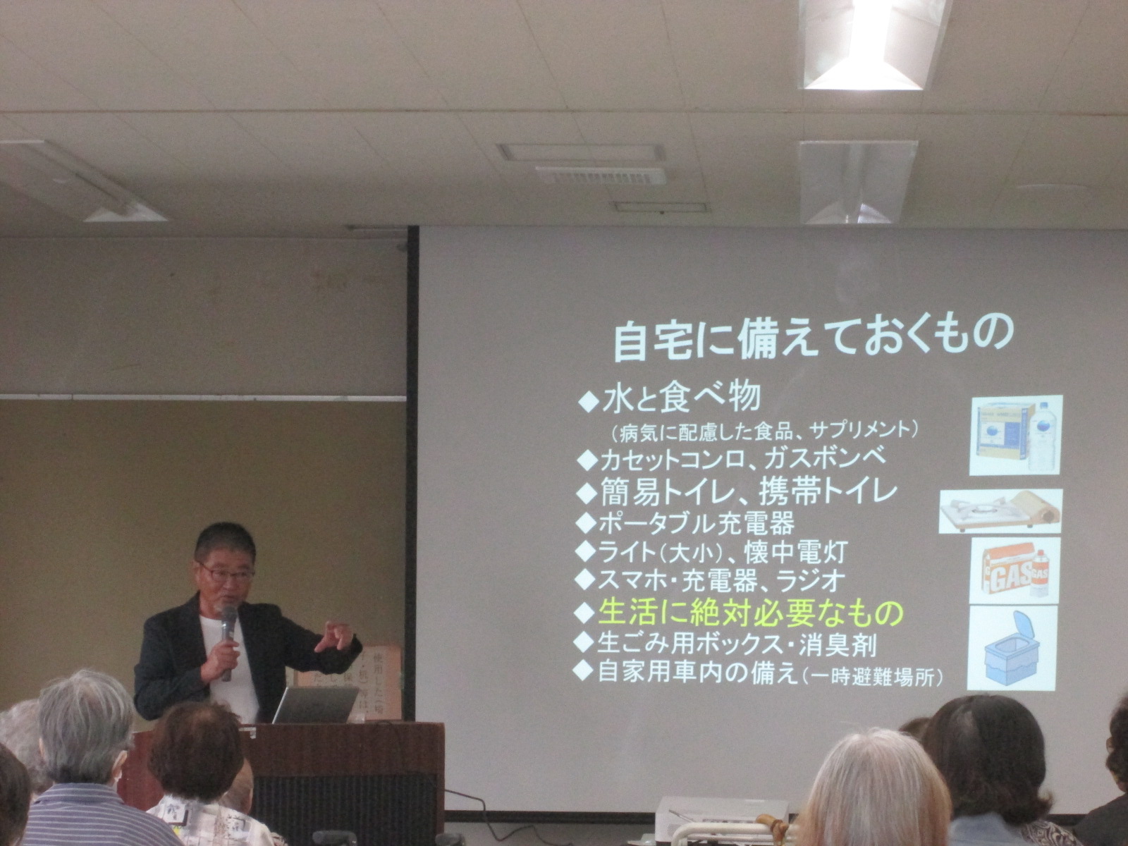 9月の朗らか・ニコニコ教室は「防災講座:自分の防災対策を見直そう!」を開催しました。気象庁に勤務されていた講師の方をお招きし、地震などの災害時の対策として、「いざという時のための備え」についてお話ししていただきました。皆様真剣にお話しを聞き、改めて防災対策について考えるきっかけとなったようです。自分の命を自分で守れるよう、事前の備えを徹底していきましょう。