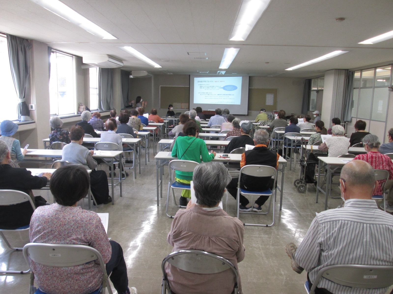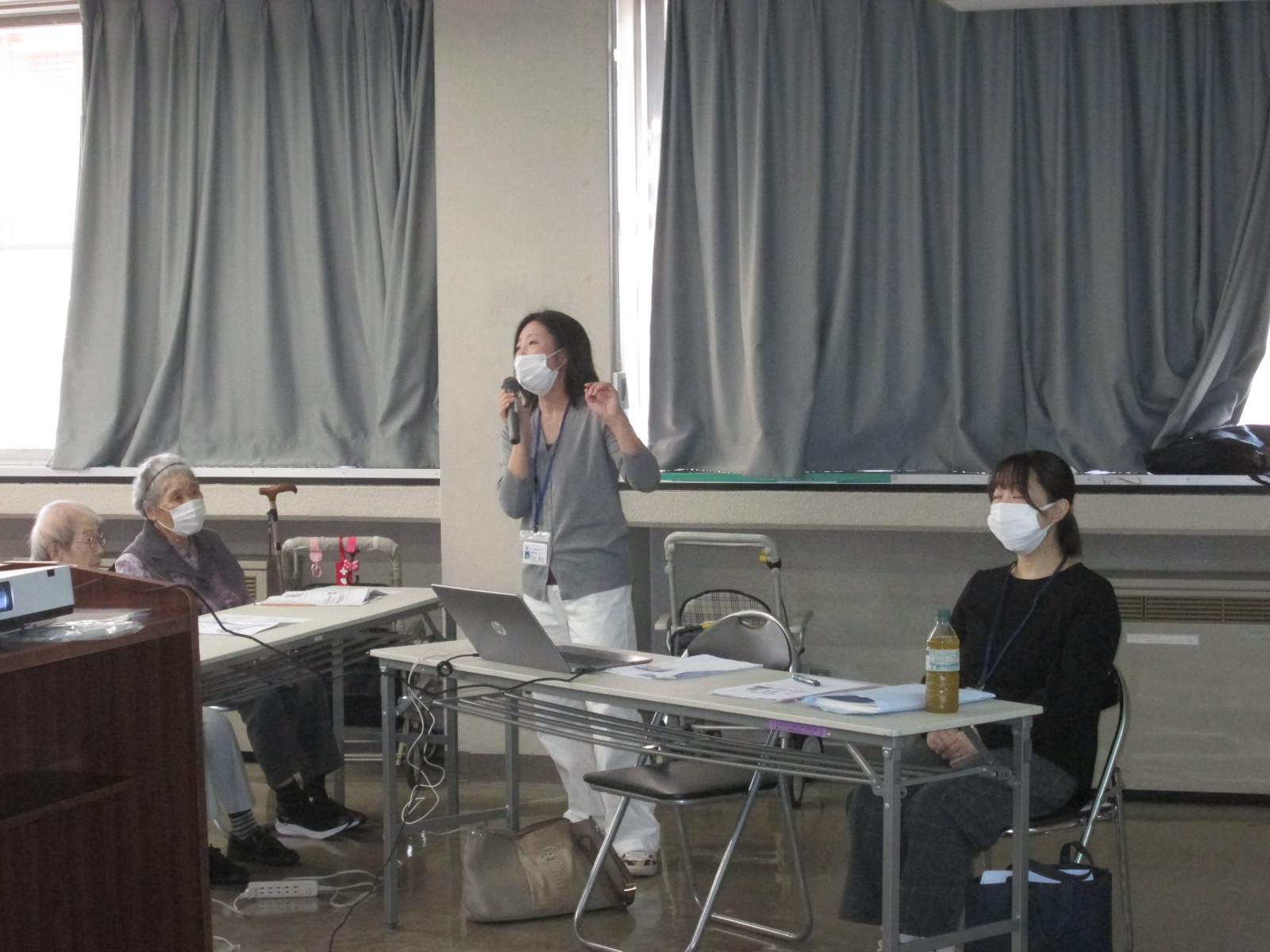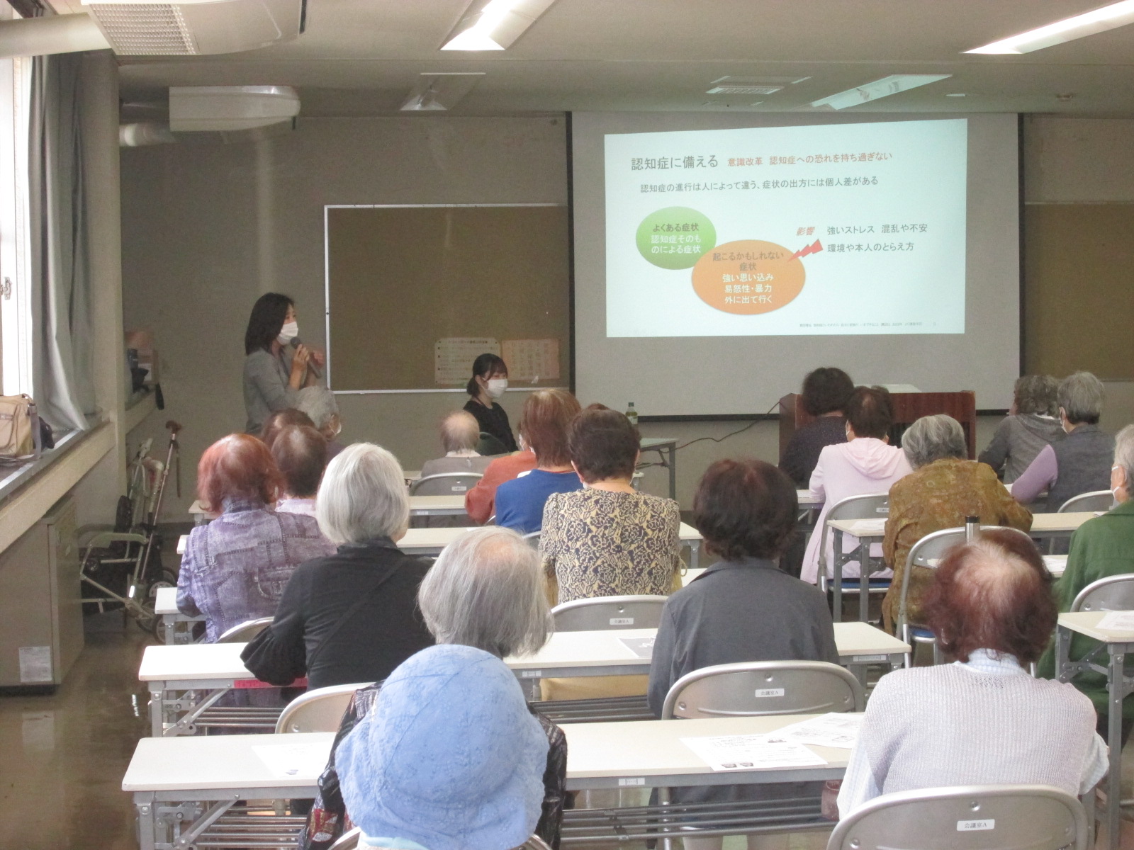 10月の朗らか・ニコニコ教室は「いつまでも自分らしく暮らすために!①認知症を正しく知る②脳とからだの健康トレーニング」を開催しました。認知症疾患医療センターから講師をお招きし、認知症についての講義とコグニサイズを実践していただきました。脳とからだを同時に使うことはとても難しく、皆様苦戦しながらも楽しく参加していただけたようでした!